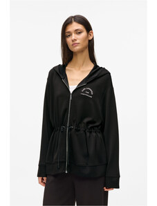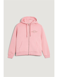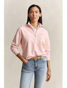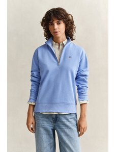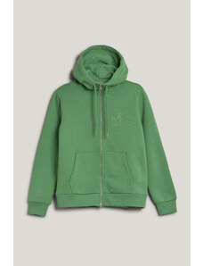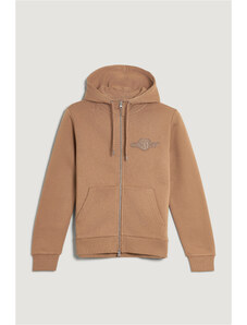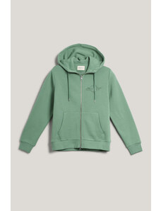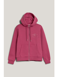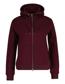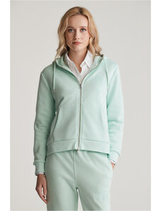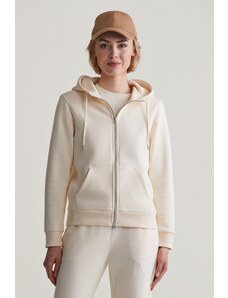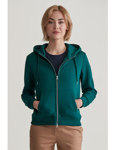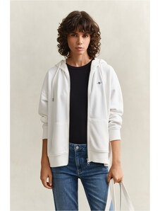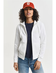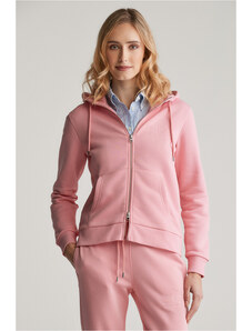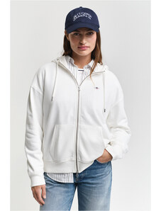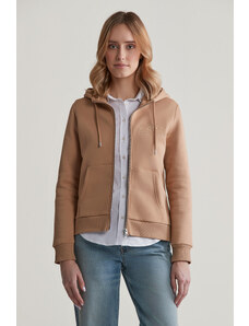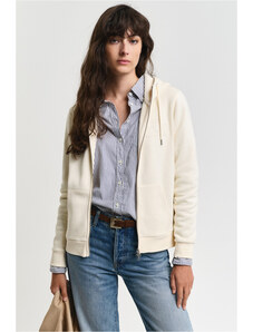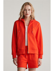 Cipzáras, kapucnival ellátott női melegítő felső. Mellkasán kontrasztos Gant logónyomattal díszített. Az egyszínű, egyenes szabású, derékrészén és ujjain bordázott szegéllyel ellátott dizájnt fém cipzár és kenguru zseb egészíti ki. A puha, pamutból készült kötött anyag szálcsiszolt hátoldallal van ellátva, így rendkívül kényelmes viseletet biztosít. Nagyon praktikus, mégis ötletes darab, amely tökéletessé varázsolja majd bármely lezser öltözékét.