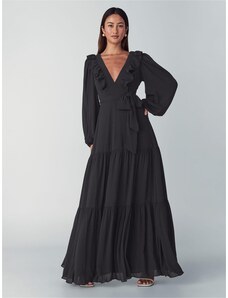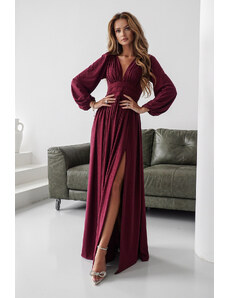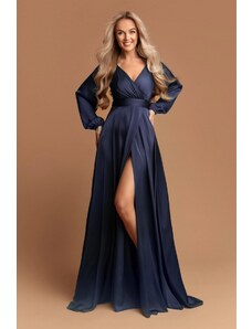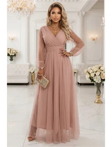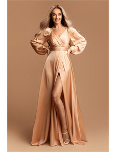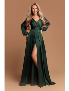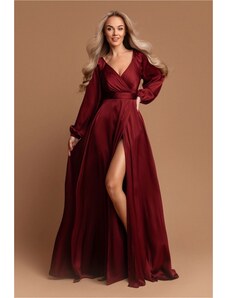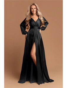 Elegant long formal dress monochrome deep folded V-neckline long, balloon, tulle elasticated sleeves strong waistband - can be completed with a tie belt wide skirt with scooped tulle high slit short zip fastening at back combination of matt satin and airy tulle suitable for year-round use ideal for a variety of social, festive and cultural events - wedding, prom, dance, theatre, concert, evening party, family celebration Material: 70% viscose, 30% polyester
