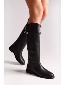Shoeberry Women's Larissa Black Skin Buckle Riding Boots Black Tone