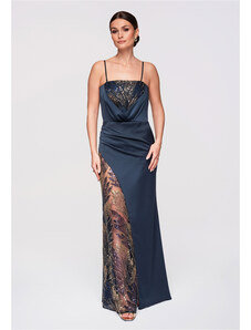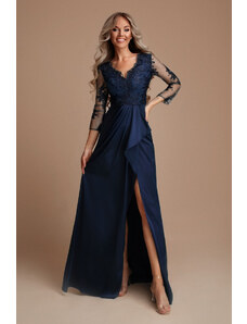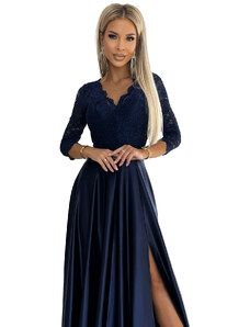 NUMOCO 215-6 LEA long elegant maxi dress with lace top and slit on the leg - navy blue
