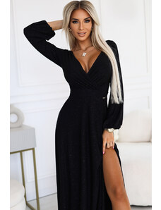 NUMOCO Fekete fényes hosszú ruha nyakkivágással, hosszú ujjú 572-2