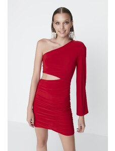 Női ruha, félvállas, piros színben. Török termék. Vékonyabb tapintású, rugalmas anyag. Kényelmes nyári viselet, akár alkalmakra is. Oldalán húzott, denevérujjas. Méretezés nélküli, kb. M-L-es méret. Hossza: 93 cm. A modell 174 cm magas és M-es méretet hord.
